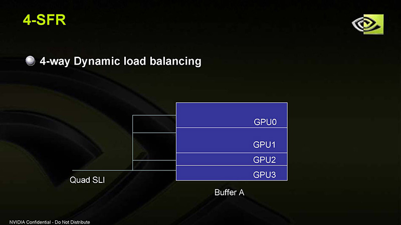 また,4-way SFRモードでは同一フレームをレンダリングするため,4-way AFRモードのような「テクスチャ素材にフレーム相関が発生して整合性を取らなければいけない」局面が発生しにくいし,発生しても小規模。4-way AFRモードと比べてCPU性能が低くても,それなりにパフォーマンス向上を図れるという特徴もある。