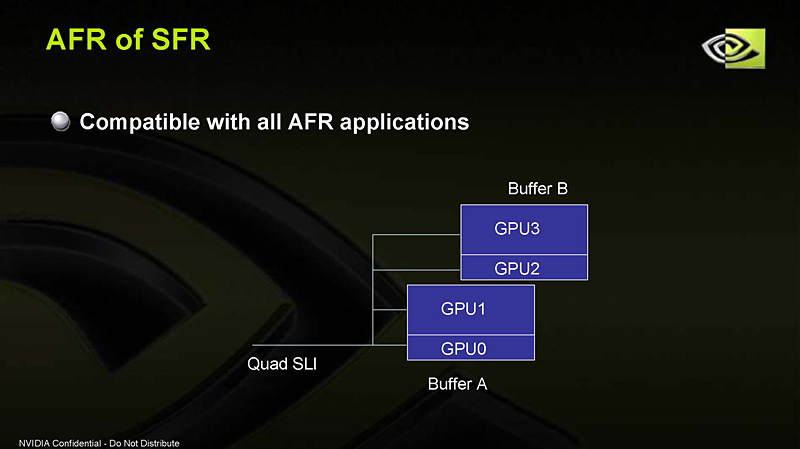 AFRとSFR,双方の長所と短所を受け継いでいるのでなかなか取り扱いが難しそうだが,基本方針としては,これまでの2グラフィックスチップ用SLIのAFRモードに最適化されたアプリケーションに対して,さらなる加速を目論む方法という認識でいいだろう。