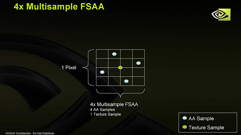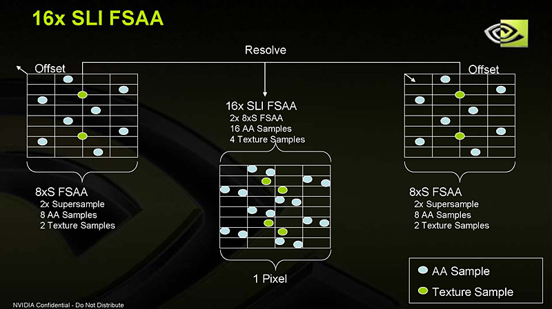 最後に紹介するのが,32X SLI AAモードだ。これは,4個のグラフィックスチップで同一のフレームを同一タイミングでレンダリングするが,各グラフィックスチップにおける,アンチエイリアシングのサンプル点の位置を変化させる(=オフセットを変える)ことで,超高品位アンチエイリアス画面を作り出そうとするもの。1個のGeForce 7900で8xSアンチエイリアシングを行うことで,トータルでは8xS×4=32xS相当のアンチエイリアシング画面が得られるという理屈である。