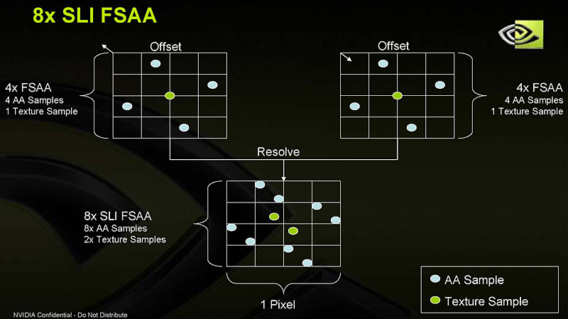 | 左は4点サンプルMSAA(Multi-Sample Anti-Aliasing,詳細は連載バックナンバーを参照のこと),中央は8点サンプルMSAAの概念図。2個のグラフィックスチップで8点サンプルMSAA(=8x SLI AA)を実現する場合は,右のように,互いにオフセットさせた位置からそれぞれ4点サンプルMSAAを行い,その結果から8点サンプルMSAA相当の映像を作り出せばいい |