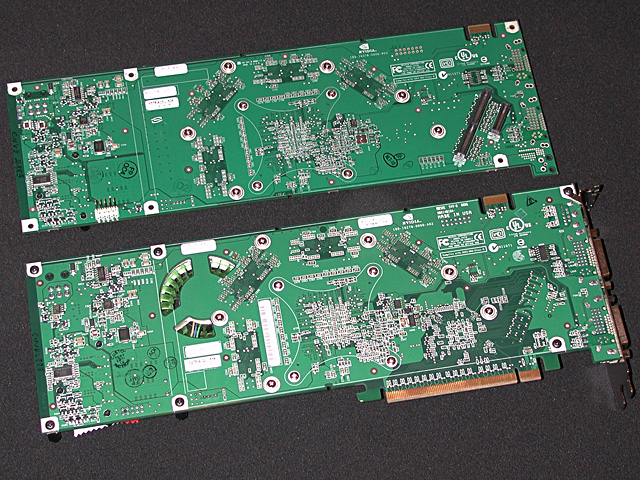 この“2階建てカード”の“1階”と“2階”に実装された2個のGeForce 7900 GX2は,“1階と2階”をつなぐ格好でリンクされる。同時に,“各階”にはSLI用のコネクタが用意されており,従来のSLIでも用意されていたSLIブリッジによって,もう一方の2階建てカードとリンクされるのだ。PCI Express x16コネクタは,カードの片方にしかないにもかかわらず,SLIコネクタが“各階”に用意されているのは,そういうわけである。