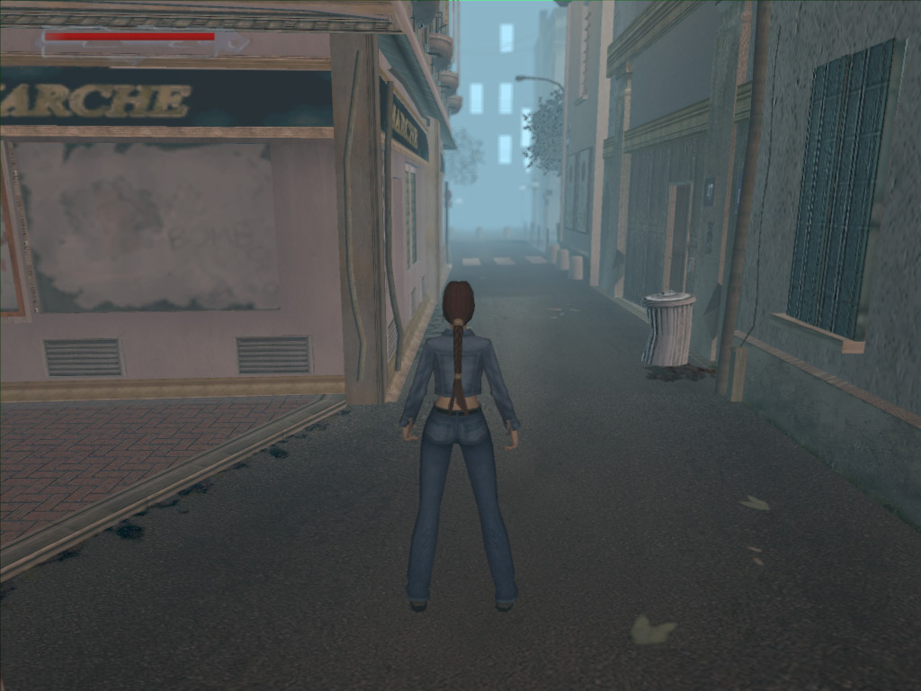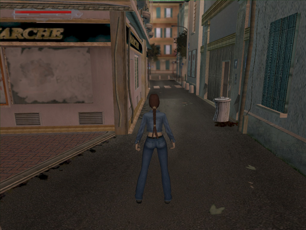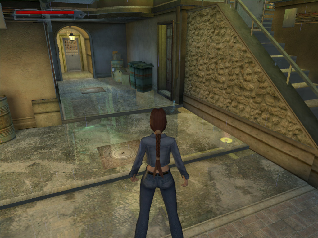 | バンプマッピングあり。正確には環境バンプマッピング。コンクリートの地面の細かい凹凸がバンプマップで表現されている。雨で濡れた感じを環境マッピング(映り込み)で表現している |