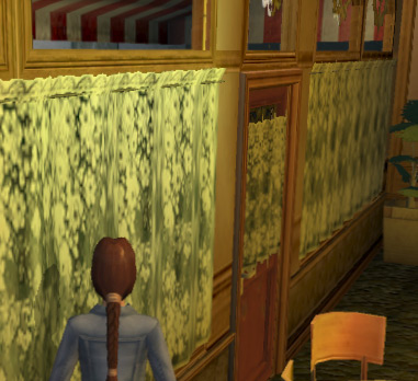 | 「Trilinear」フィルタリング適用時の画面。きつい角度で奥に見えるカーテンの模様に注目。模様がはっきりしないもやっとした感じになっている。ちなみに「Bilinear」では,奥だけでなく,手前からピンぼけ感が漂ってしまう |