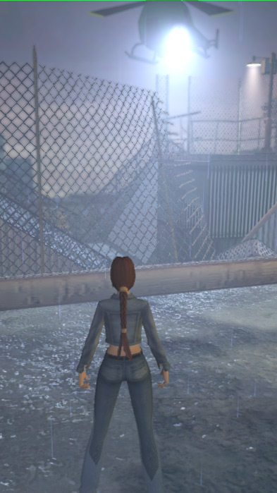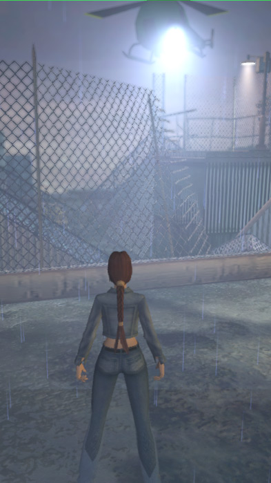 Effects in Reflectionsオン時。上空のヘリのサーチライトから溢れ出る光(Glow効果)が環境マップに反映されているため,地面の環境バンプマッピングにその青白い光が反映されている |