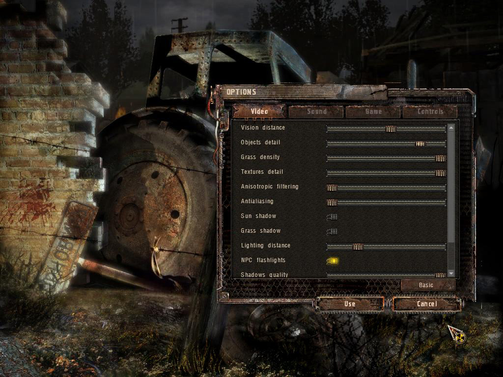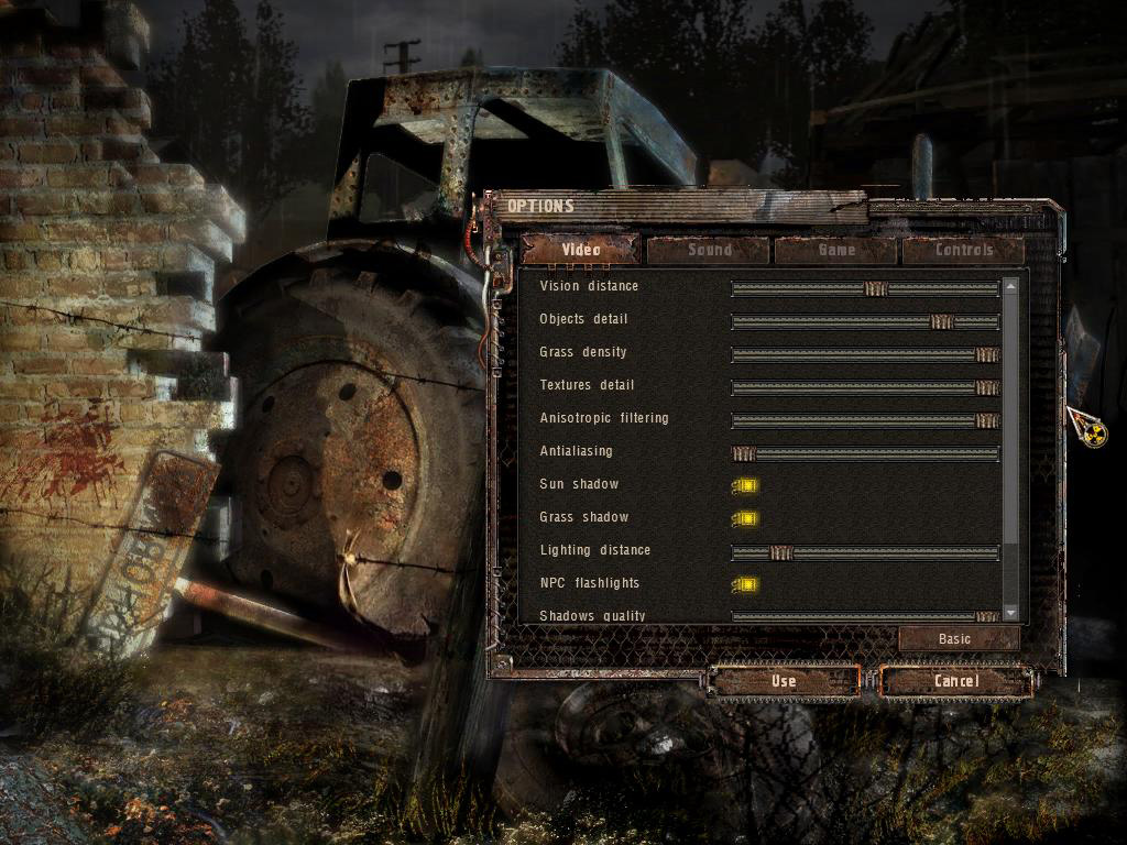 そこでS.T.A.L.K.E.R.のテストに当たっては,高負荷設定の代わりとなる「特別設定」を用意することにした。下に,標準設定と特別設定の詳細を順に示したが,標準設定では一部のオブジェクトに対してのみHDR(High Dynamic Range)レンダリングを適用する「Objects dynamic lighting」設定をベースとし,異方性フィルタリング(「Anisotropic filtering」)は行わず,影の設定も簡素化する。一方特別設定では「Full dynamic lighting」でHDRレンダリング設定を一番上に引き上げ,さらに異方性フィルタリングや影も最大限有効化している。