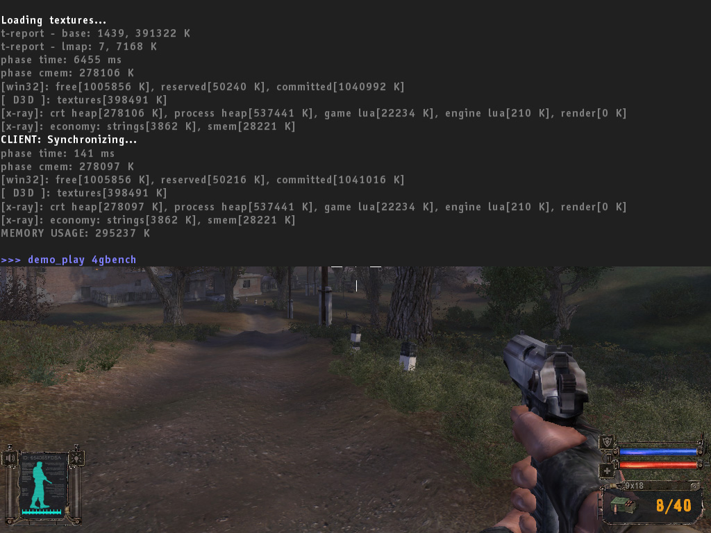S.T.A.L.K.E.R.では,セーブデータにかかわらず,天候が常時変化し続けるため,どうしてもスコアに若干の誤差が出るのを避けられない。また,初回計測時にはキャッシュの影響が若干出ることもあり,今回は「4回計測し,2〜4回めのスコアの平均をスコアとする」方法を採用した。