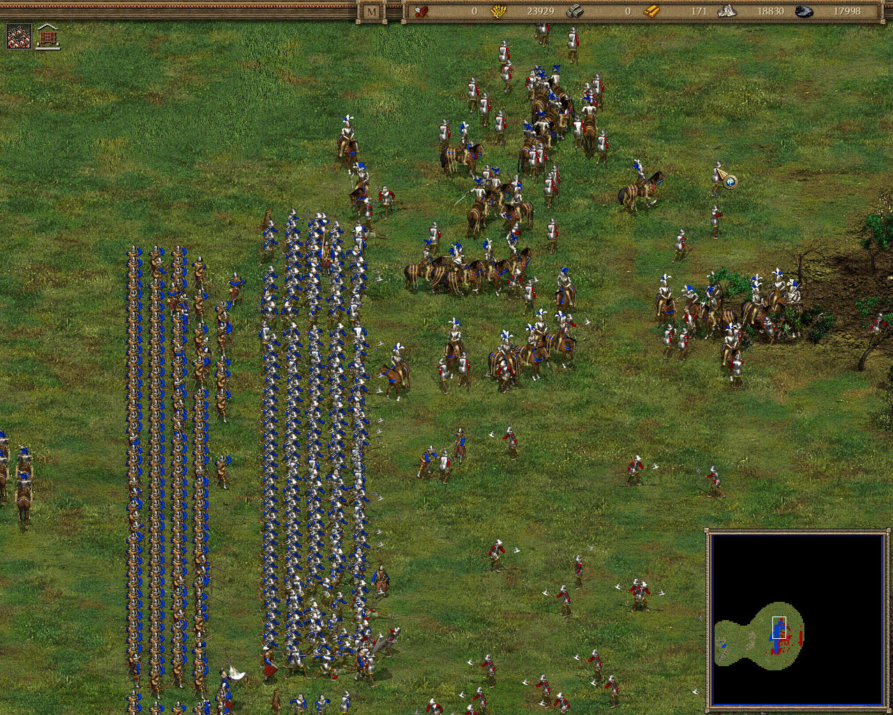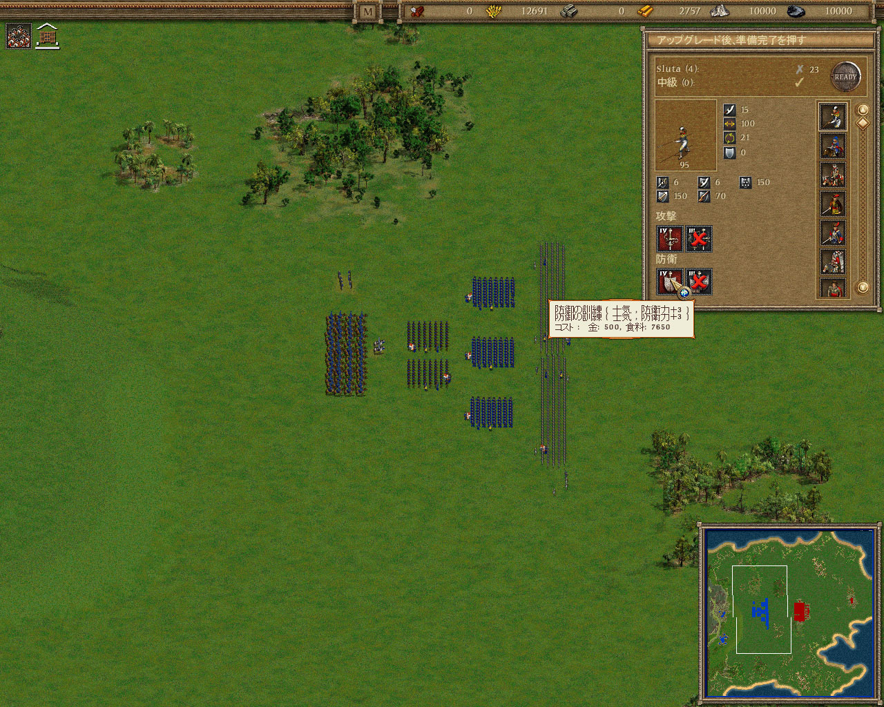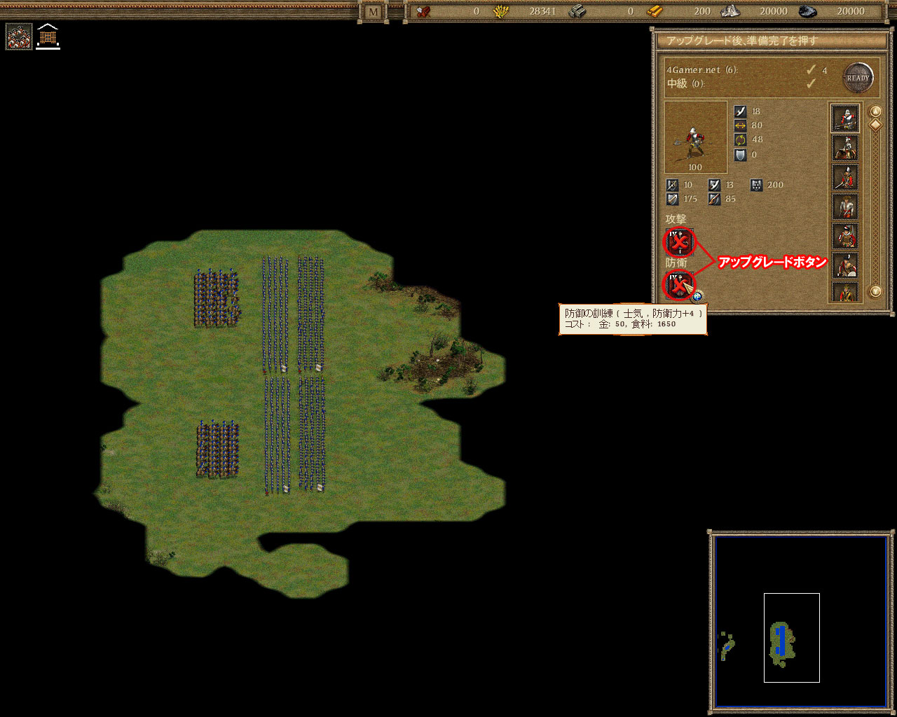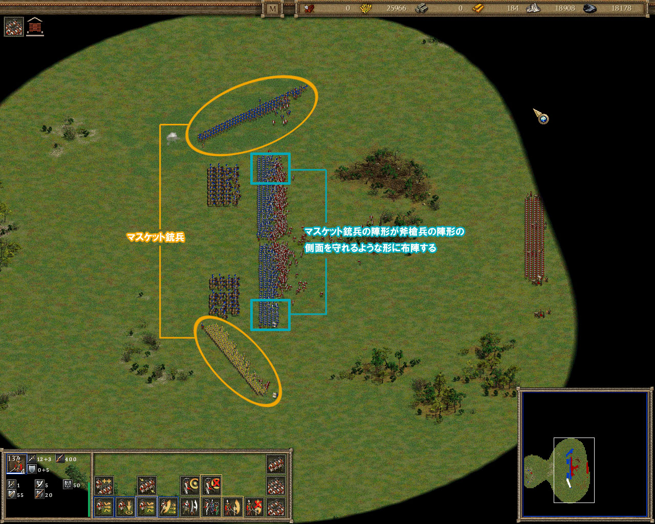 難易度は「中級」(英語版ならHard)を選択しよう。このミッションの目標は,自分の砦を防衛しながら敵の砦を奪取または破壊することだ。 ゲームを開始すると,右の図のような画面が出る。ここで行うことは,ユニットのアップグレード。このミッションでは斧槍兵の攻防のアップグレードが3回ずつ行えるので,3回とも押しておこう。 プレイヤーは青軍で,軍勢は斧槍兵とマスケット銃兵と騎馬仕官16cの混成部隊で構成され,対する赤軍は,斧槍兵の大軍と少量のカノン砲,竜騎兵18cからなる。このミッションでは,味方の3種のユニットをどのように使い分けるかがポイントとなる。 (1)マスケット銃兵に一斉射撃させる戦いが始まったら,まずは左隅にある味方の砦の前にいる30人の町の住民を,砦の中に入れよう。これで砦の防衛はOK。万全を期すならば町の住民数人を火縄銃兵に育成して,砦の中に入れなおしても良いが,万が一砦が敵のカノン砲に撃たれた場合修理しなければならないので,町の住民は10人以上は残しておく。主力の軍隊のほうに目を向けよう。とりあえずその場を動く必要はないが,マスケット銃兵は「攻撃禁止」にしておく,これは,敵を引きつけてから一斉射撃するためだ。敵のカノン砲に撃たれて,そこそこの数の兵士が削られているはずだが,ここはじっと耐えておく。ただし,敵が側面を見せて陣形の旗手・士官等が見えたら,騎馬士官16c数騎を使って狙撃しにいくといい。 しばらくすると敵がしびれをきらして突撃してくるので,敵が十分に近づいたと思ったら,攻撃許可し,銃弾の雨を降らせよう。しかし,スペインのマスケット銃兵は鎧を着ているため,攻撃動作に入ってから射撃するまでに一呼吸時間がある。よって,攻撃許可するタイミングは難しいが,最大の効果を得られる敵との間合いは,プレイヤー自身で試して会得してほしい。