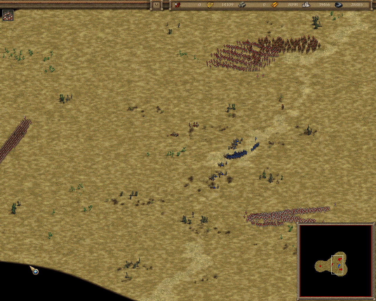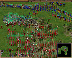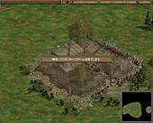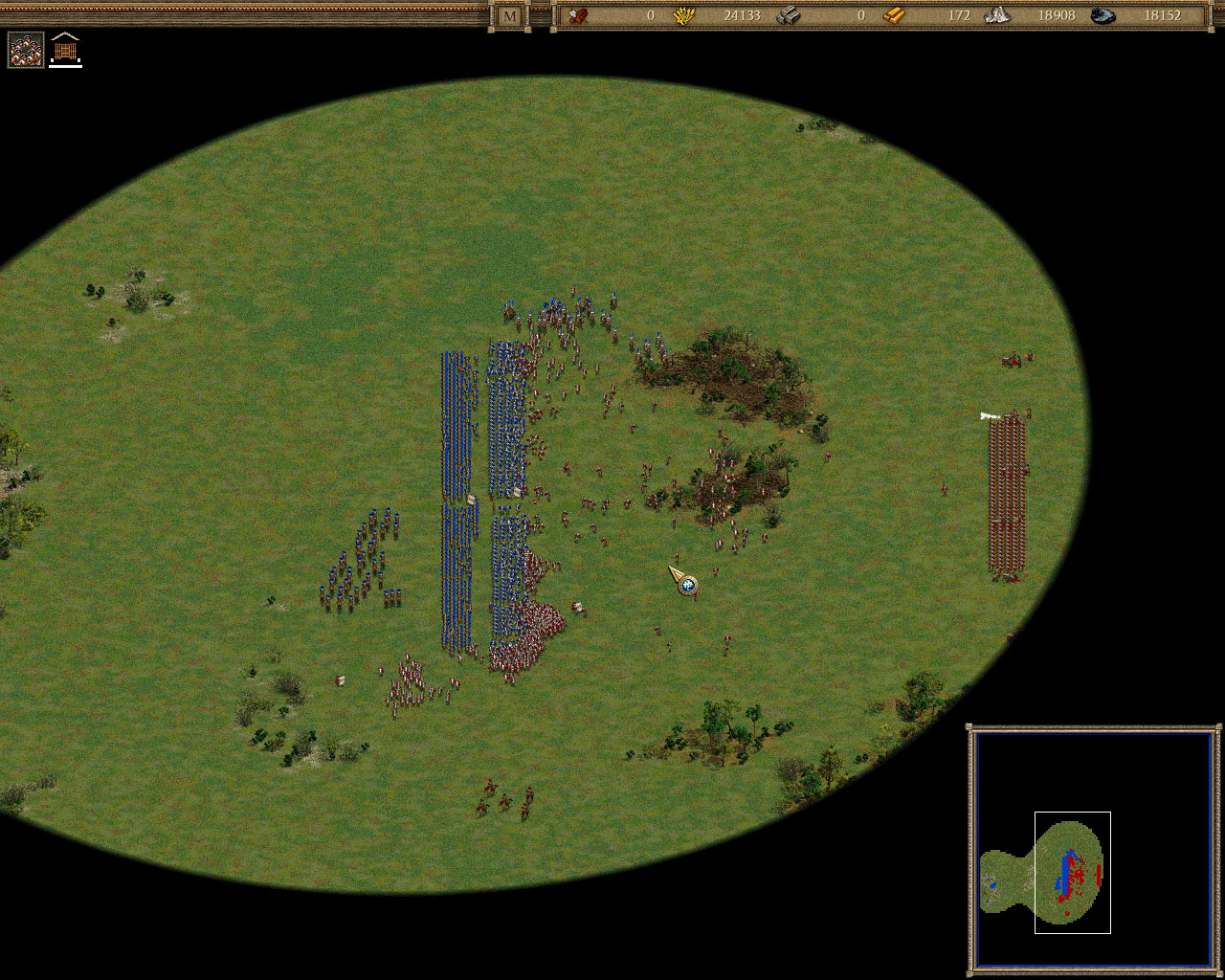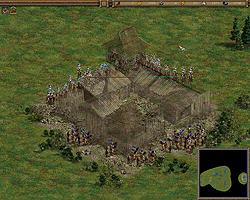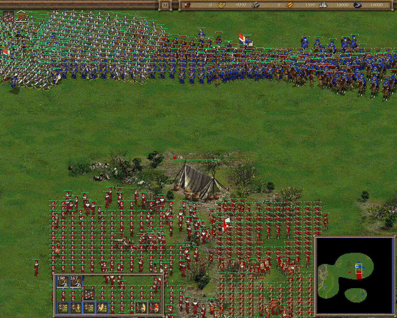 難易度は「中級」(英語版ならHard)を選択しよう。このミッションの目標は,自分の砦を防衛しながら敵の砦を奪取または破壊することだ。 ゲームを開始すると,右の図のような画面が出る。ここで行うことは,ユニットのアップグレード。このミッションでは斧槍兵の攻防のアップグレードが3回ずつ行えるので,3回とも押しておこう。 プレイヤーは青軍で,軍勢は斧槍兵とマスケット銃兵と騎馬仕官16cの混成部隊で構成され,対する赤軍は,斧槍兵の大軍と少量のカノン砲,竜騎兵18cからなる。このミッションでは,味方の3種のユニットをどのように使い分けるかがポイントとなる。 (1)マスケット銃兵に一斉射撃させる戦いが始まったら,まずは左隅にある味方の砦の前にいる30人の町の住民を,砦の中に入れよう。これで砦の防衛はOK。万全を期すならば町の住民数人を火縄銃兵に育成して,砦の中に入れなおしても良いが,万が一砦が敵のカノン砲に撃たれた場合修理しなければならないので,町の住民は10人以上は残しておく。主力の軍隊のほうに目を向けよう。とりあえずその場を動く必要はないが,マスケット銃兵は「攻撃禁止」にしておく,これは,敵を引きつけてから一斉射撃するためだ。敵のカノン砲に撃たれて,そこそこの数の兵士が削られているはずだが,ここはじっと耐えておく。ただし,敵が側面を見せて陣形の旗手・士官等が見えたら,騎馬士官16c数騎を使って狙撃しにいくといい。 しばらくすると敵がしびれをきらして突撃してくるので,敵が十分に近づいたと思ったら,攻撃許可し,銃弾の雨を降らせよう。しかし,スペインのマスケット銃兵は鎧を着ているため,攻撃動作に入ってから射撃するまでに一呼吸時間がある。よって,攻撃許可するタイミングは難しいが,最大の効果を得られる敵との間合いは,プレイヤー自身で試して会得してほしい。