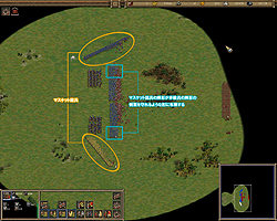 (1)カノン砲のぶどう弾で敵を粉砕戦いが始まったら,カノン砲6門を,それぞれ右の図のように均等に間隔を空けて移動させ,そのまま少しずつ前進させる。一戦めとは違って,待っていてはダメ。敵も同じように前進して迎え撃ってくるが,そうしたら敵の陣形の固まっている部分に向けてぶどう弾をお見舞いしよう。ぶどう弾を撃つには,カノン砲の操作画面の中の「ぶどう弾を発射」をクリックするだけでOK。撃つまでに数モーションを要するため,これも自分で試しながら最適な敵との間合いを探そう。ぶどう弾の効果範囲はかなり広いので,多少遠くから撃っても効果がある。 (2)火打石銃兵同士の銃撃戦は先制攻撃がカギ。騎兵をうまく囮に使うさきほどのマスケット銃兵vs.斧槍兵と違って,相手も銃撃してくる。そのため,引きつけて撃つ方法はやりにくい。火打石銃兵は銃に対する防御力が0のため,最大射程から撃ってもそれなりのダメージを与えることができる。まずは囮の竜騎兵18c数騎を先行させ,まず相手に一発撃たせよう。そうしたらすかさず火打石銃兵の陣形を前進させ,相手に一発食らわせる。普通に撃ち合うとお互いに損害を出すので,囮の騎兵を使って相手に撃たせてしまうのがカギだ。また,なるべく敵の側面を狙うようにし,射撃する際は局地的には常に数で上回る状況を作るように心がけよう。最大射程から撃ち合った場合,銃弾のばらつきが大きいため,なるべく多くのユニットで銃撃するほど弾が当たりやすい。火打石銃兵は攻撃力(銃の火力)は高いが防御力は皆無。とにかく初段が最重要だ。うまく撃つことができれば敵の陣形は一発目で散り散りになる。逃げ出した敵は,第一戦と同様,騎兵で追いかけて倒そう。 (3)最後はセオリー通りに,包囲して複数方向から攻めるだけ第一戦と同様に,敵にはカノン砲と陣形一つが残っているはず。相手のカノン砲のぶどう弾を食らわないように,側面に部隊を展開しよう。ただし正面にも少しは残しておくこと。あとは両側面から射撃し,陣形が崩壊したら騎兵で掃討するという同じパターンで。![]() このミッションの特徴は,所持資源が少ないこと。食料がなくなると餓死が起きて士気が下がるし,金がなくなれば陣形が組めなくなる。鉄か石炭がなくなれば銃が撃てなくなる。とくに食料と金が足りないので,戦いは時間との勝負。速攻で一気にカタをつけよう。 槍兵のアップグレードが攻防ともに3回までできるが,資源が足りないために,全部はできない。速攻を意識して,攻撃を3回と防御を2回アップグレードしておく。 ミッションの目標は,拠点の奪取(四つのテントの占領)なので,すべての敵を倒す必要はない。敵の士気を崩壊させ,テントの付近から排除してしまえば十分だ。 (1)槍兵で道を拓く陣形を一切組んでいない状態で始まるので,まずは槍兵/マスケット銃兵/火縄銃兵/竜騎兵17cといった,それぞれのユニットごとに陣形を組んでおこう。本来ならばできるだけ多くの兵士で陣形を組んだほうがいいのだが,今回に限っては進軍速度のほうが大事。なので,細かいことは気にせずにさくっと陣形を組みたい。適当な数の兵士で陣形を組んだら,すぐさま全軍で前進開始。余った兵士は後ろから付いてこさせるように(陣形内の兵士が減った場合,この兵士を使って随時補充する)。敵軍の槍兵と狩人が先遣隊としてやってくるので,槍陣形で迎え撃ちつつ,どんどん前進。敵軍はまったく陣形を組んでいないので,個別に撃破すれば楽勝だろう。側面を叩くために,敵陣から見てマップ上方へ向けて進軍していく。 (2)強引な一点突破を図り,そこを活路にして一気にたたみかける敵陣の側面に友軍が集結したら,槍兵を先頭に敵陣の中心あたりの一点へ向けて一斉に突撃しよう。マスケット銃兵と火縄銃兵は,槍兵の盾にする形で徐々に前進。銃兵の前に味方兵士がいると,射撃の効率性ががくっと落ちてしまうの痛いが,ここではあえて後方から援護する形にしよう。槍兵の隙間から少しずつ射撃させ,なるべく早く槍兵の進路を開くようにする。陣形内の兵士が減ってきたら,後ろから付いてきている兵士を補充して陣形を建て直すこと。竜騎兵17cとスーの騎馬槍兵は,敵陣の背後に回って攻撃しよう。こうして進軍スピードを最優先目標として一気に突破していくと,敵の士気があっという間に崩壊していくのが分かるはずだ。ただし,これは敵が陣形を組んでおらず,統率が取れていないためにできる戦法である。 (3)四つのテントを占領するという目的に集中テント付近の敵ユニットを排除することに集中しよう。逃げ出した兵士を深追いする必要はない。奪取したテントはすぐに燃やしてしまうように。あとはテント付近にいる敵を見つけ次第,直接に攻撃を指示して倒しに行かせるとよいだろう。