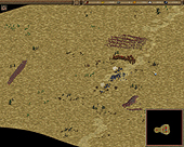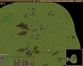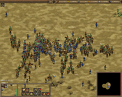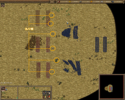 (2)マスケット銃兵は下がり,側面に展開。「守備」状態の斧槍兵で敵を受け止める一発撃ったマスケット銃兵は,左の図のように斧槍兵のななめ後ろに向かって後退させよう。なお,この状態でもマスケット銃兵の陣形は「守備」にする。その場を動かないようにすることできれいなラインを保つことができ,効率的に射撃できるからだ。ななめ後ろに後退するのは,斧槍兵の側面(緑の印)を防御するためである。敵はかまわず突撃してくるので,「守備」状態にした斧槍兵で敵を受け止めよう。「守備」にした陣形は攻撃力に+9,防御力に+9(旗手がいればそれぞれ+10,+11)の補正がある。しばらく受け止めていれば,敵の陣形は崩壊して逃げ出す。 (3)騎馬士官16cの出番・・・逃走する敵軍の掃討作戦を敵が逃走しはじめたら,騎馬士官16cを両側面に展開する。そして逃走する敵の退路へ向かって突撃し,逃げている敵兵士の掃討をしよう。逃げている無抵抗の兵士だけを相手にし,まだ戦っている陣形の兵士は相手にしないこと。奥のほうにはまだ無傷の陣形やカノン砲が控えているはずなので,そちらには行かないようにする。騎馬士官16cは一人の敵を倒すごとに接近戦攻撃力に+10のボーナスを得る。集中して掃討作戦にあたらせて攻撃力ボーナスを溜めていくと,ぐんぐん強くなるのだ。 (4)側面からの斧槍兵の突撃&騎馬士官16cの援護で,残りの敵軍を撃破あと残っている敵軍は,斧槍兵の陣形一つとカノン砲数門のはず。逃げている敵をだいたい倒し終わったら,斧槍兵の陣形を敵の陣形の側面に移動させ,横から突撃させる。その際,後ろから騎馬士官16cも一緒に突撃させる。このときには騎馬士官はかなりの接近戦ボーナスを得ているはずなので,効率的に敵を倒すために「接近戦のみ」で戦おう。なお,必ず斧槍兵を先行させるようにし,騎馬士官16cはその後ろから進めること。その理由は,主に斧槍兵で敵の攻撃を受け止め,騎馬士官がダメージを受けないようにするためだ。 (5)騎馬士官16cで砦を包囲し,砦を奪取敵の陸上戦力をすべて撃破したら,残るは砦。残っている騎馬士官16cを全選択し,敵の砦を包囲する。マスケット銃兵で包囲してもいいが,騎馬士官のほうが銃に対する防御力が高いので残存性が高いということと,足が早いので砦に近づきやすいというメリットがある。なお,砦の場合,完全に張り付くように近づいてしまえば射撃してこない。中の敵を全員倒したら(カーソルが変わるので分かる)砦内部に突撃。占領するとクリアとなる。