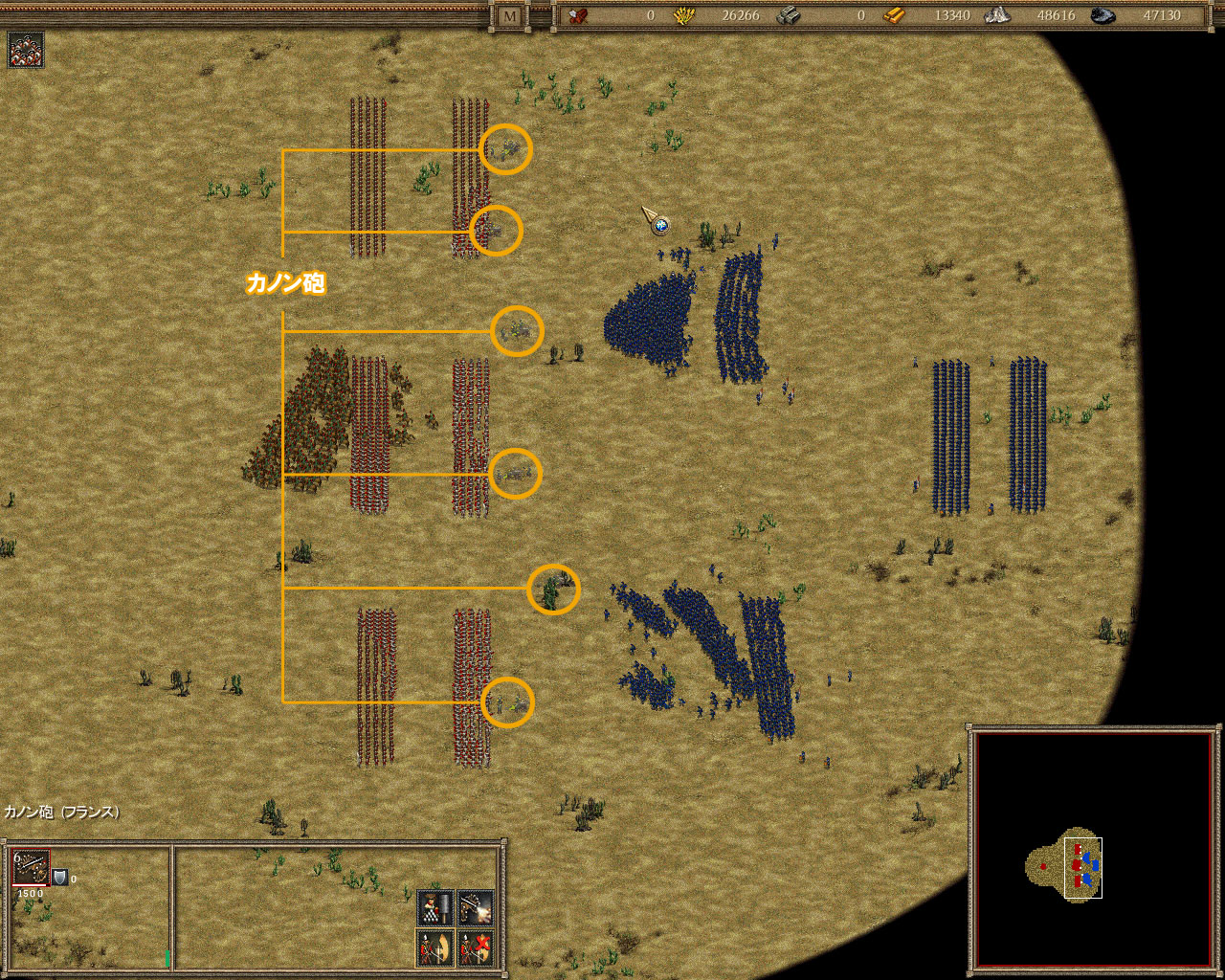 ![]() このミッションの目標は敵軍を全員倒すこと。第一戦とは打って変わって,火打石銃兵だらけのマップになっている。ポイントは,カノン砲のぶどう弾の扱いと,火打石銃兵同士の戦闘のやり方だ。