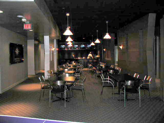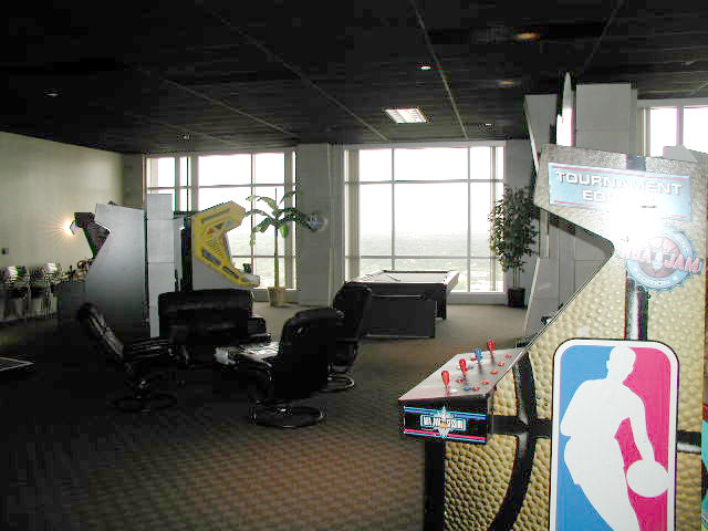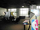 | どこかのバーのようだが,これはEnsemble Studios社のカフェテリア(写真左)。さらにその向かい(写真の右手側)には,アメリカの開発会社にはお決まりともいえる息抜きの場(写真右)が用意されているが,取材時は開発の大詰めを迎えていたため,すべてのゲームマシンの電源が落とされていた |
