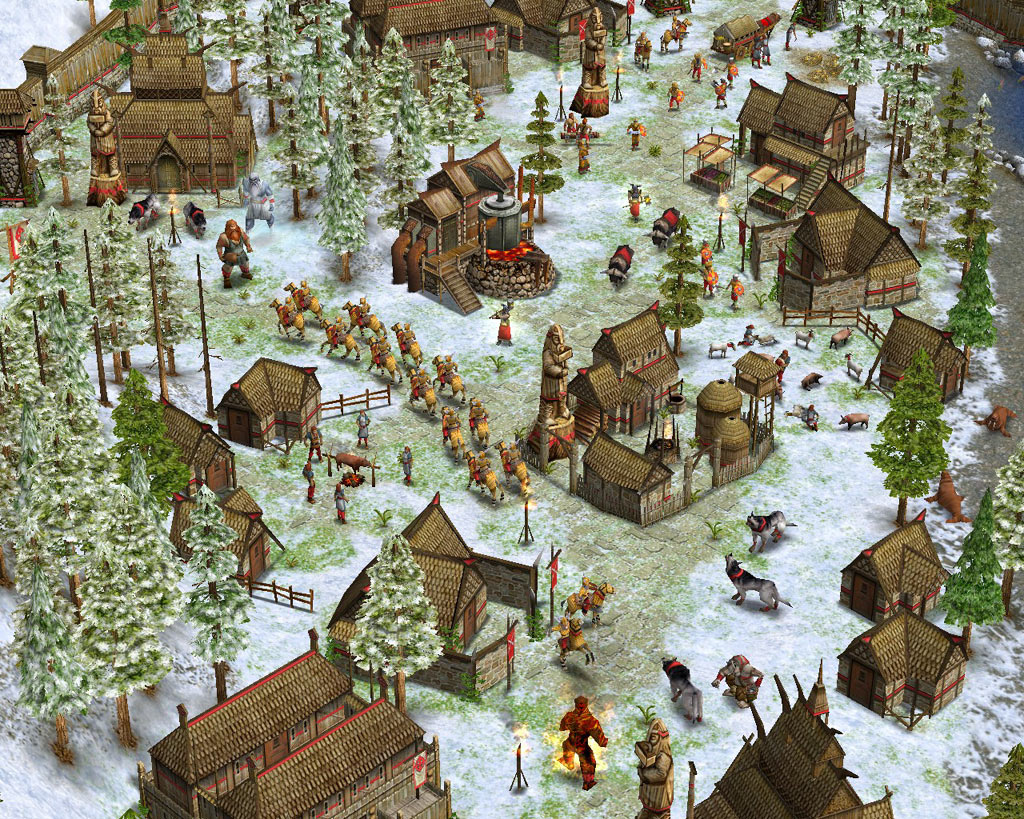 例を挙げておこう。ノースのオーディーン神でプレイした場合,Mythic Ageで"タイア"(Tyr)と"バルディア"(Baldr)という副神が登場する。タイアは砂漠であっても雪を降らせ,同時に大量発生するオオカミで農民達を襲う"フィンブルウィンター"(Fimbulwinter),バルディアは農民ユニットすべてをヘルシル(Hersir)というヒーローユニットへと変更する"ラグナロック"(Ragnarok)のゴッドパワーを持っており,また,タイアはフェンリスウルフの生産や歩兵ユニットへのアップグレードができるのに対し,バルディアは騎馬兵やシージ船へのアップグレードができる。このように,各神々に特殊能力と特殊ユニットが用意されているのがユニークで,相手や地形の状況に合わせてパターンを変えていくなど,プレイヤーに戦略的な思考が要求されるのだ。ここが,「Age