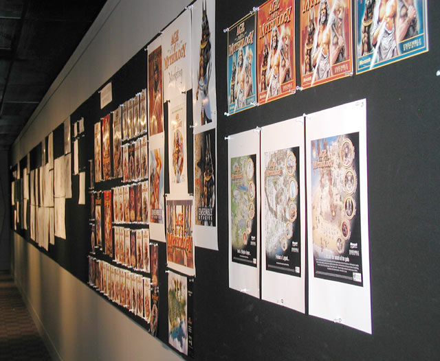 | Ensemble Studios社の通路には,広告用のアートやボックスのサンプル,ポートレート,イメージ画などが貼られていた |