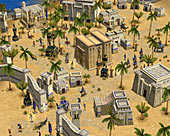 | 悪名高い(!?)エイジシリーズのプレリリース用画面写真らしく,かなり作られた画像ではあるが,その分Age of Mythologyの壮大さが強調されているのも事実。エジプトのチャリオットの軍列がジャイアントの乱入を食い止めようとしているシーンだ |
