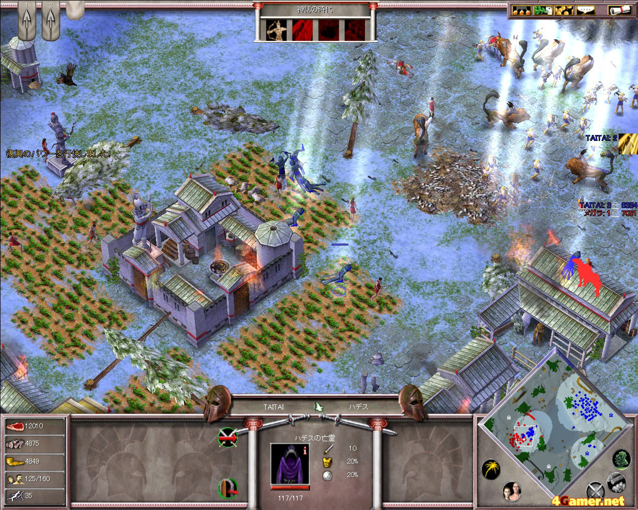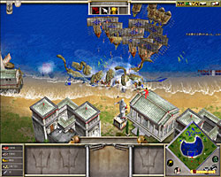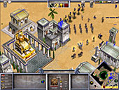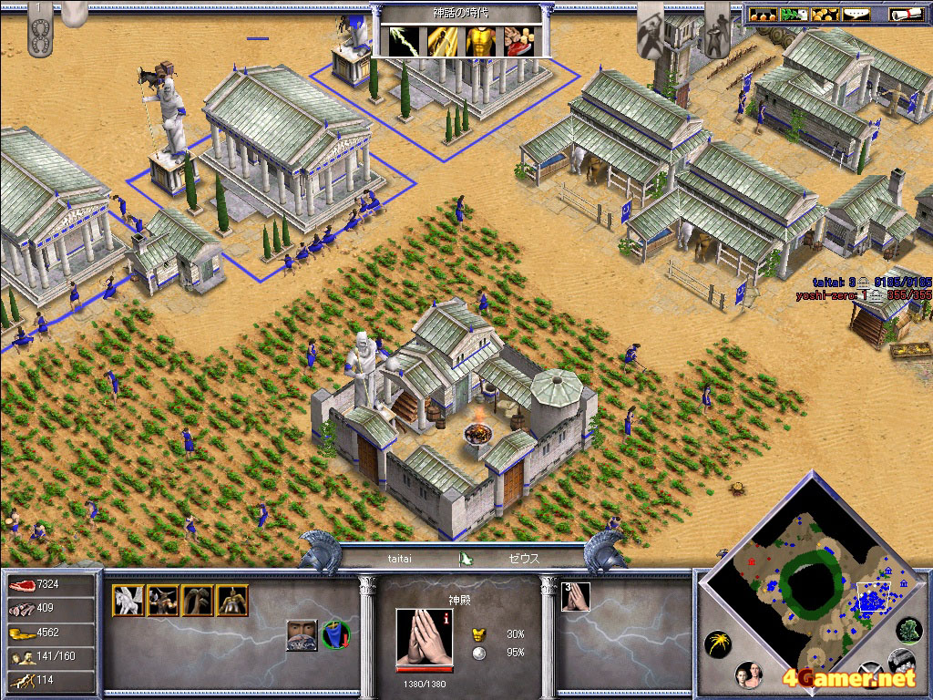 AoMの新たな資源,そして大きなキーワードでもある「恩恵」の集め方は文化圏によって違うが,ギリシャの集め方は普通の資源となんら変わらない。神々を崇める神殿を建て,町の人をそこで祈らせればいいだけ。つまり畑で作業したり,木を切るのとまったく同じである。この方式は,祈りの間は町の人がほかの資源を集められないという欠点を持つが,ほかの文化圏の方式に比べるとプレイヤーが意図したときに必要な量の恩恵を集めやすいという特徴があり,そのおかげでギリシャは大量の神話ユニットを揃えやすいという印象を受ける。