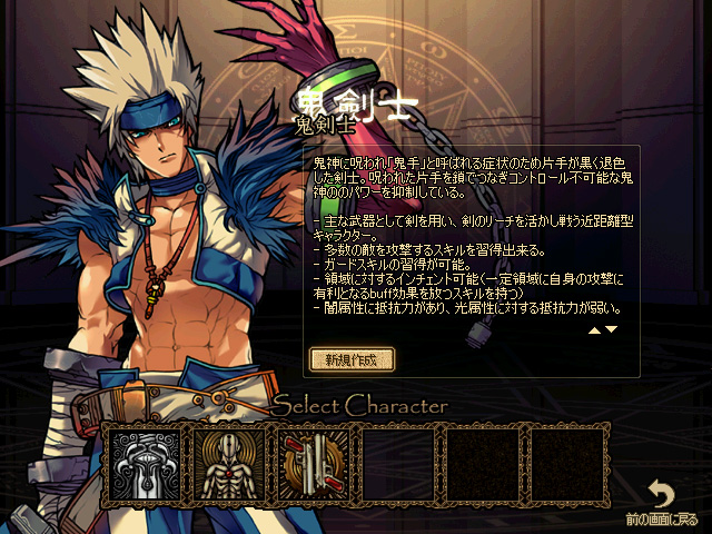 鬼神の魅力に取り憑かれ,片手の鎖を解き放ってしまった鬼剣士。鬼神と同化したため,闇属性攻撃への抵抗力が極めて高い。さらに,鬼神にちなんだスキルを数多く習得できるようになる。