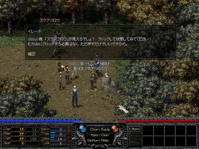 キャラクターが死ぬとイレーネは消えてしまう。森の中にはライーネというNPCもおり,体力が大幅に減ってしまったときや,ちょっと強めのモンスターと戦いたい場合には,ライーネの近くへ行って体力を回復してもらおう