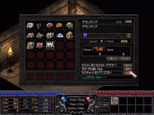最初,自分のキャラクターには一切の装備が用意されていない。持っているのはタイマツと,イレーネから渡された修練場のマップだけだ。せっせとモンスターを倒してグローブやヘルム,ブーツなどの防具,バトルソードなどの武器を手に入れたり,商店で木刀を購入したりしてキャラクターの装備を充実させていく必要がある。