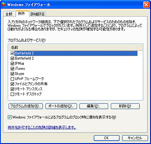 手順(4) 以上の設定が終わると,Windowsファイアウォールの例外タブには4個のBF2設定が追加されているはずだ。「OK」を押せば,Windowsファイアウォールの設定は完了