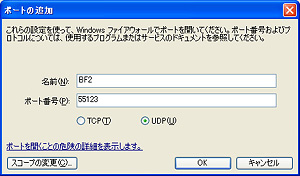 手順(3) 「ポートの追加」ウインドウが開いたら,「名前」には「BF2」,「ポート番号」には「55123」と入力し,「UDP」のラジオボタンを選択して「OK」を押す。これで,手順2のウインドウに,BF2という項目が追加されているはずだ。続けて,同じ手順で55124,55125,16567のUDPポートも設定しよう