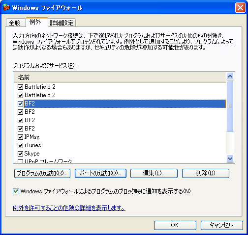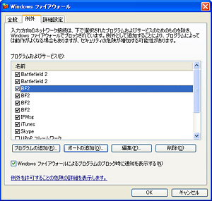 手順(2) BF2をインストールしていれば,「プログラムおよびサービス」に「Battlefield 2」が追加されているが,さらにポートを開く必要がある。「ポートの追加」ボタンを押そう