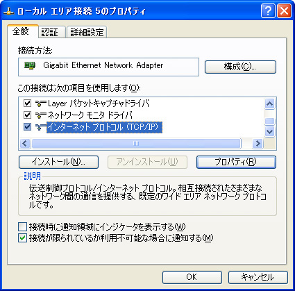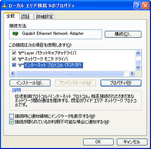 手順(5) ルーター設定の前に,まずはPCのプライベートIPアドレスを固定する。コントロールパネルのネットワーク接続から,「ローカルエリア接続」のプロパティを開く。「この接続は次の項目を使用します」の「インターネットプロトコル(TCP/IP)」を選択し,「プロパティ」ボタンを押す