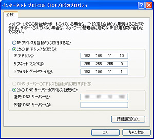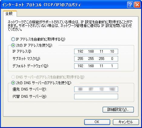 手順(6) 「インターネットプロトコル(TCP/IP)のプロパティ」ウインドウが開いたら,「次のIPアドレスを使う」のラジオボタンを選ぶ。今回利用しているバッファロー製ルーターの場合,ルーターのプライベートIPアドレスは初期設定が「192.168.11.1」なので,「IPアドレス」には,「192.168.11.X」(Xには2〜254の任意の整数が入る)と入力すればいい。今回は「192.168.11.10」とした。ルーターのプライベートアドレスが「192.168.0.1」のときは,「192.168.0.X」(Xは2〜254の任意の整数)とすればいい。次に「サブネットマスク」は「255.255.255.0」,「デフォルトゲートウェイ」は,ルーターのプライベートIPアドレス(バッファロー製ルータなら192.168.11.1だ)を入力する。さらに,「次のDNSサーバーのアドレスを使う」を選択して,プロバイダから指定されているDNSサーバーのグローバルIPアドレスを入力しておこう(ここでは事情によりボカしている)。入力したら「OK」を押す