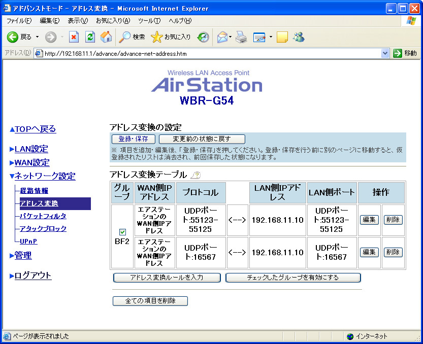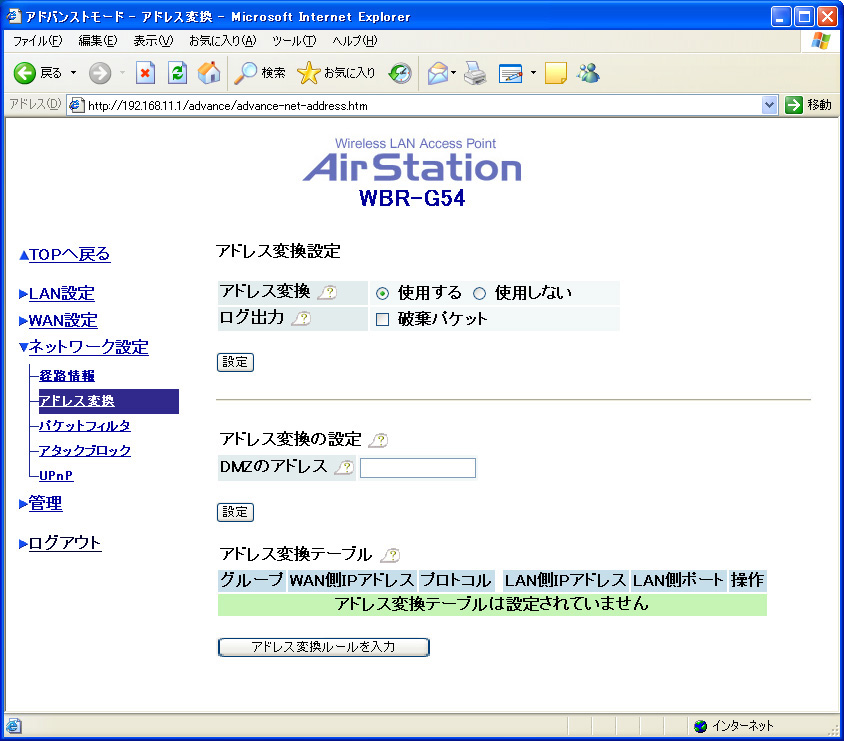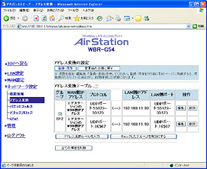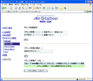 ではさっそく,WVR-G54を使って,アドレス変換設定を行っていきたい。