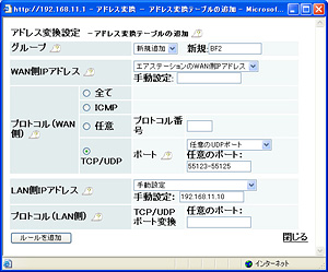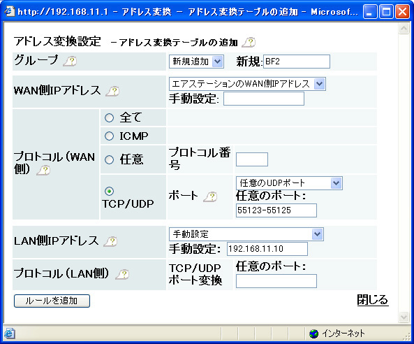 手順(9) バッファロー製ルーターでは,アプリケーションごとにアドレス変換をグループとして管理できる。「グループ」の「新規追加」には「BF2」と入力しよう(このグループ分け機能は,他社製品だと提供されていないことがある)。「WAN側IPアドレス」は「エアステーションのWAN側IPアドレス」(自動設定)のまま。「プロトコル(WAN側)」は「TCP/UDP」のラジオボタンを選択し,「ポート」は「任意のUDP」ポートを選択する。「任意のポート」には,「55123-55125」と入力。55123-55125は,55123〜55125のポートを設定するという意味だ。このように連番指定ができないルーターもあるので,その場合は55123,55124,55125を順番に登録しよう。「LAN側IPアドレス」は「手動設定」にし,手順(1)〜(2)で設定した,ローカルサーバーPCのプライベートIPアドレスを入力する。ここまでの手順を忠実に実行したなら,プライベートIPアドレスは192.168.11.10(もしくは192.168.0.1)である。ここまで来たら「ルールを追加」ボタンを押せばOKだ。最後に,Windowsファイアウォールで設定したUDPの16567番ポートも,55123〜55125番と同様に設定しておこう。