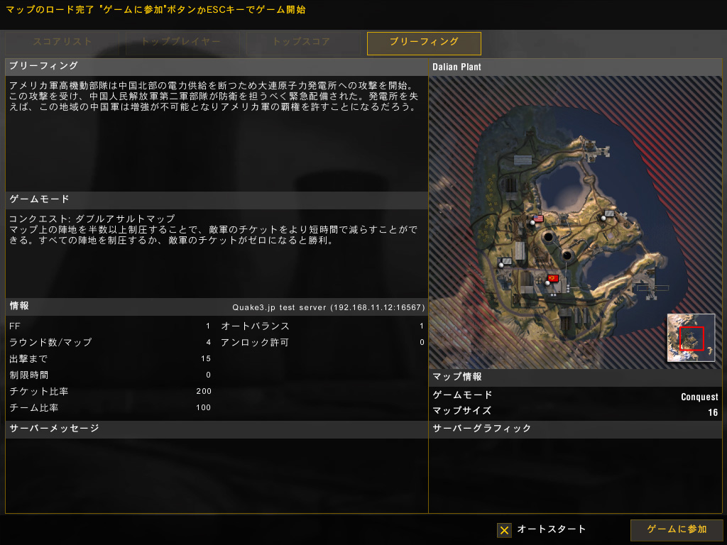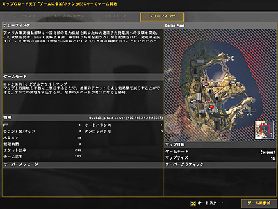 手順(14) マップのロードが完了すると,このような画面になる。右下の「オートスタート」にチェックを入れておくと,2名以上のプレイヤーがマップに登場して,プレイ可能になったとき,ゲームが自動的にスタートするようになる。ひとまずは「ゲームに参加」ボタンをクリック