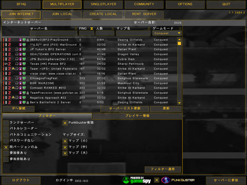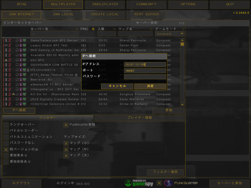 手順(16) (友人のPCから)BF2を起動し,MULTIPLAYERを選択。サーバーリストの更新が終わると,画面の中央左に「IPへ接続」というボタンが表示されるので,これをクリックする