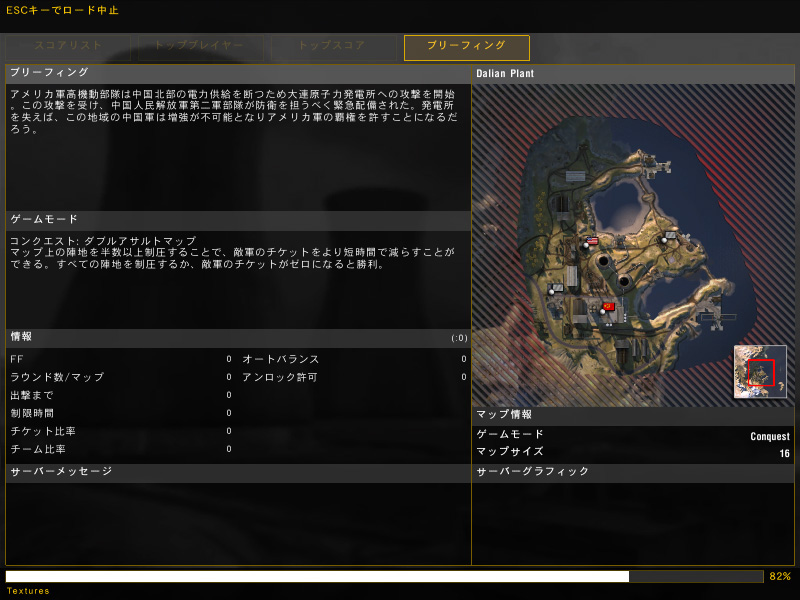 手順(18) 無事に接続できれば,このように"いつもの"ロード画面へ移行する。ゲームのバージョンが一致しなかったり,ここまでの設定のどこかがおかしかったりすると,友人のPCのBF2に,バージョンやグローバルIPアドレスが違うといったエラーメッセージが出るので,この場合は,マルチプレイサーバーを運営している人に設定を見直してもらおう