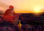 | サルクリーチャーが,夕日をバックに膝を組んでタイクと話すという,'80年代の青春ドラマのような設定が笑える。自分が,子供を持つに値する男だという証明が必要なのだ。ちなみにオリジナルのB&Wでは,クリーチャーの性別については一切触れられていなかった |