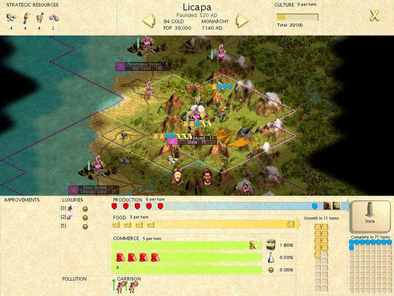 改良点はまだまだある。タバコ,バナナ,オアシス,塩,砂糖,翡翠など地域に合わせた贅沢品が追加されているし,インタフェースも,一つの都市にほかの都市の食料などを一気に収集したり,メッセージなどのウインドウをワンキーでトグルできたりするなど変更されている。科学技術ごとに,最初に発見した文明にリーダーユニットが登場するというシステムも,ゲームのテンポを上げるのに一役買うはずだ。