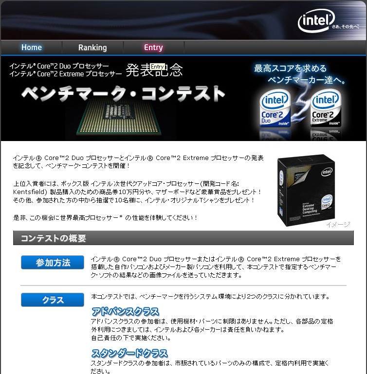 2006年8月25日正午,インテルはCore 2 Duo/Extremeプロセッサーの購入者を対象としたキャンペーン「インテル Core 2 Duo / Extreme プロセッサー発表記念ベンチマーク・コンテスト」(以下Core 2 Duo/Extremeベンチコンテスト)をスタートした。