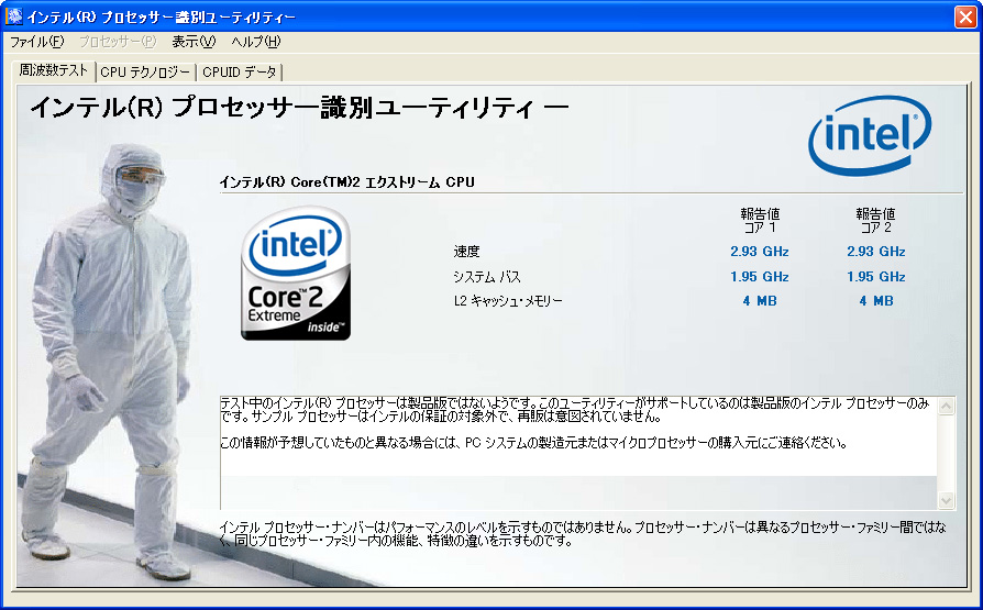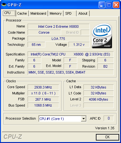 こちらはCPU-Zの実行ファイル「cpuz.exe」を実行したところ。やはりCore 2 Extremeプロセッサー X6800の情報を取得したところで,動作クロックやキャッシュ容量などの情報が見て取れるが,CPU-Zを利用する場合,事務局に提出する必要があるのは,CPUのロゴが写っているこのウィンドウだ |