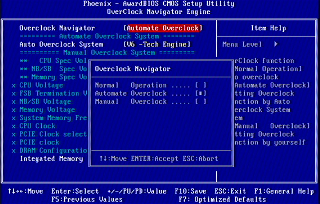 Intel P965 Expressチップセットを搭載する某マザーボードのBIOS設定画面。この製品では「OverClock Navigator」から「Automatic Overclock」に設定すれば,自動オーバークロック機能が有効になる。このように,自動オーバークロック機能を利用するのは,ルールの範囲内だ。なお,言うまでもないことだが,ここで「Manual」を選択すると不正になるので注意
