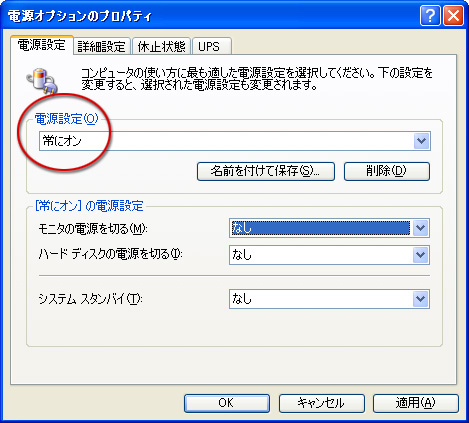 自作PCの場合は基本的に,EISTは標準で無効になっているはずだが,ショップブランドPCなどでは,有効になっているかもしれない。Windows XPのコントロールパネルから「電源オプション」→「電源設定」タブへと進み,「電源設定」を「常にオン」にしておくと,EISTは無効化できるから,念のため確認しておこう。
