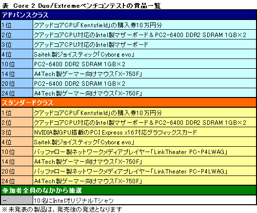 両部門とも,最高スコアを獲得した人には,Intelの次世代クアッドコアCPU「Kentsfield」(ケンツフィールド,開発コード名)の10万円分購入券がプレゼントされる。Intelのデスクトップ向け最上位モデルは999ドルに固定されており,国内の販売価格はたいてい12〜13万円。「提供できる製品は10万円まで」という景品法の関係で,無料プレゼントとまではいかないが,最高スコアを叩き出した人は,ミドルクラスのCPU程度のコストで,クアッドコアCPUをゲットできるのだ。