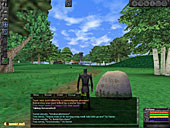ちなみに目の前のNPCは,どうやらTrainerらしい。Murayamaの文章にあるように,この人にスキルを上げてもらえるようだ。ただし,まずはレベルを上げなければどうしようもない。マニュアルを引っかき回して魔法の使い方を覚え,早速チャレンジ! ……同じレルムの人間には使えません,なんてメッセージ(もちろん英語で)が。残念。ちょっとこの村(どこか分からず)を出て,モンスターに魔法を試してみよう。命中。続けて命中。そして死。死体からアイテムを探って,次の獲物に突撃だ〜! 命中,命中,そして死。って,筆者が死んでいるではないか。レベル5までは死んでもペナルティがないらしいので,「/release」でTrainerの前まで戻って,また戦闘。勝ったり,負けたり(つまり死んだり)を繰り返す。モンスターを左クリックでターゲットしたとき,右下のウインドウに表示されたモンスターの名前の色で,相手の強さが分かるというシステムに気づいたのは,10回以上死んでからであった。