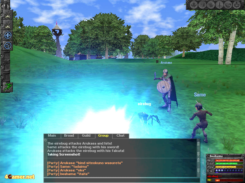 ともあれ,ゲームスタート。いきなり目の前に人がいてちょっとドギマギしたが,しばらくしてNPCと判明。チャットの仕組みが分からず,あたりの人に聞こえるようにNPCに向かって話していたのがちょっと恥ずかしいが,まぁ,気にしない。なお,特定の人物にだけ聞こえるように話す場合は,「/t」のあと,スペースを入れて相手の名前。さらにスペースを入れてメッセージを入力すればいいようだ。覚えておこう>筆者。