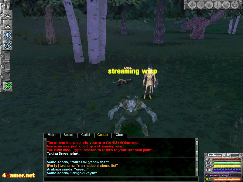 wisp)は,Sameを倒したあと,返す刀でこっちに向かってきたのである。尖った耳の優男(Elf)である筆者のキャラは,たかだかこっちの膝くらいまでの体長の生物に瞬殺された。ぎゃあ。ショックのため,しばらく「/release」(復活)もせずに死んだ状態のまま呆然とする筆者。「くっそ〜,もっと固い仲間が必要だな〜」と思った次第である。