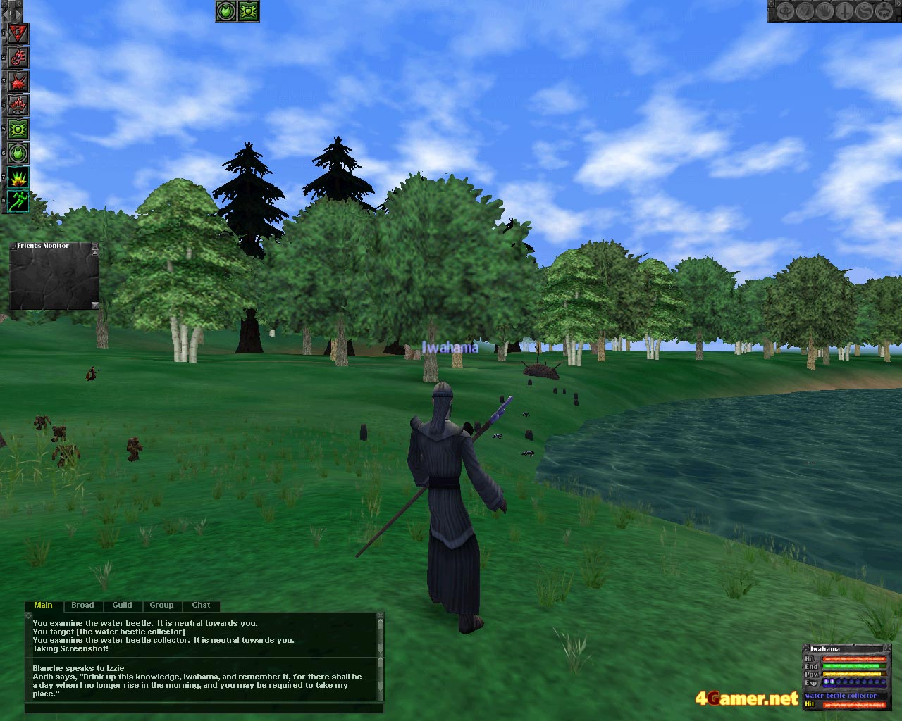 na Nogをあとにして,目指すはまだ見ぬ強敵のいるところ。さっそく新呪文の練習台にしてくれよう,というわけだ。Tir na Nog(の東口)の周りはあまり強いモンスターがいないようなので,Ardeeの北の川べりに行き,名前が黄色い(つまりこっちよりちょっとレベルが高い)Water
