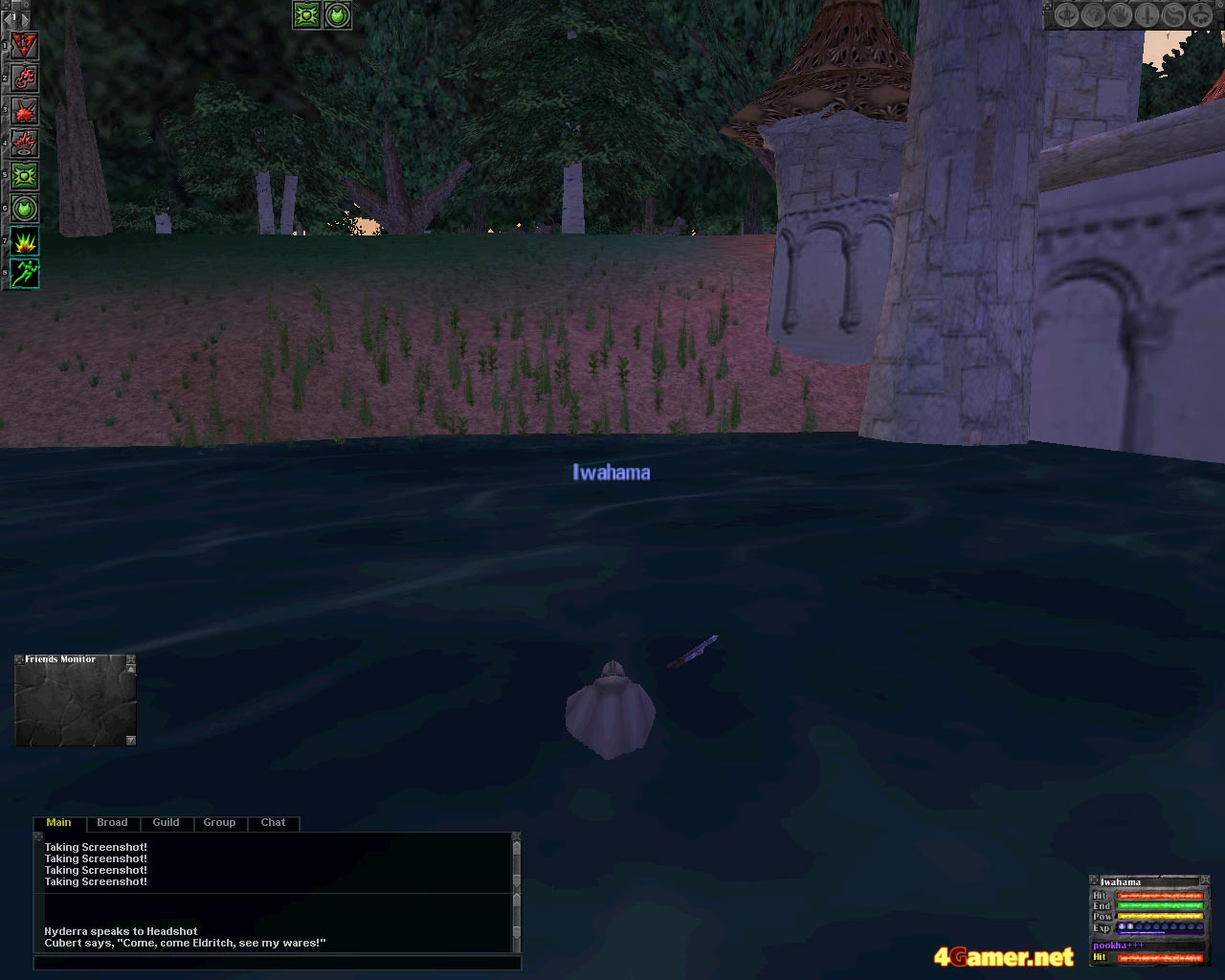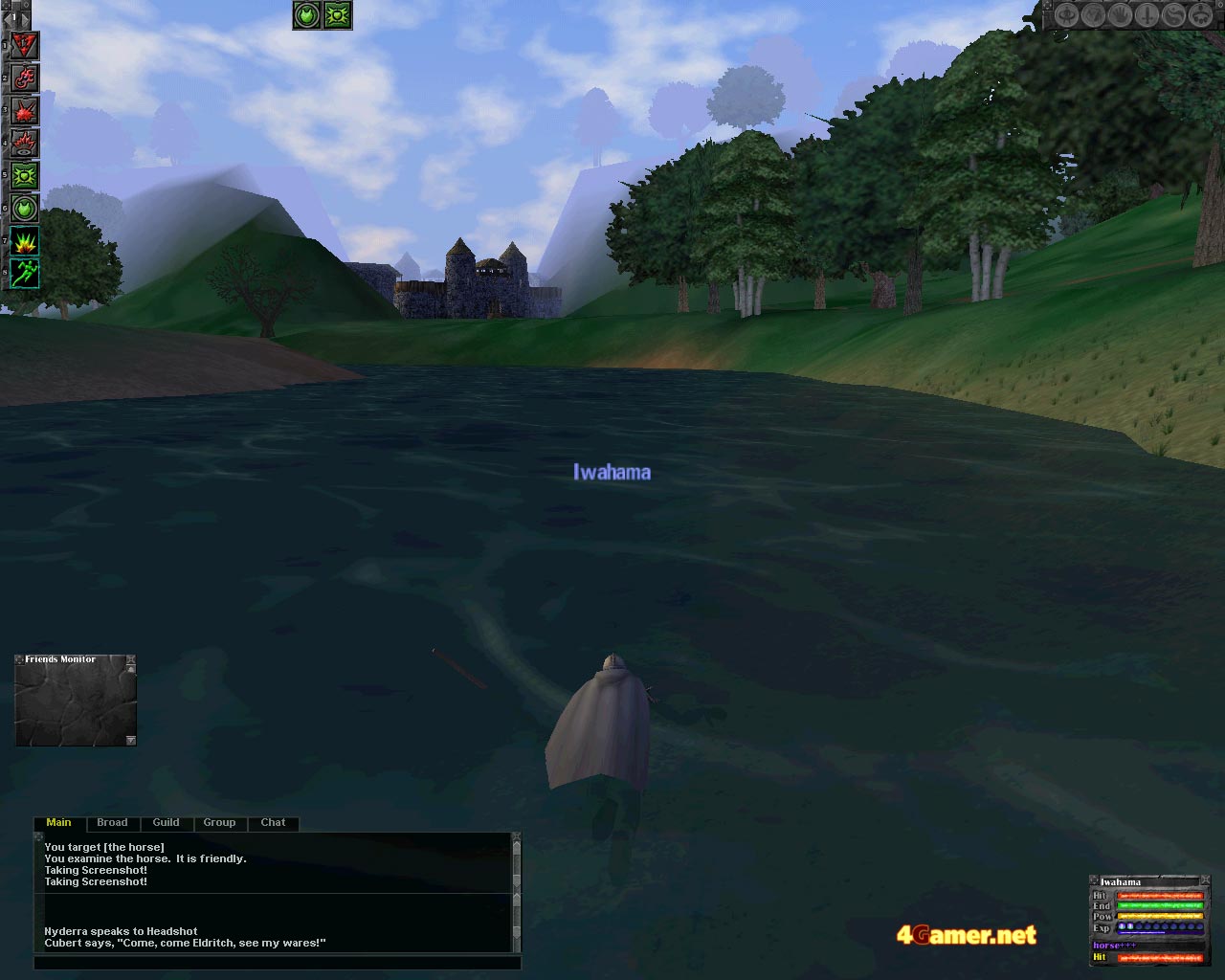 今回向かったのは,川である。DAoCのキャラクターは泳げるのかどうか,ずっと気になっていたのだ。確か泳ぎに関するスキルはなかったな〜と思いつつ,ちょっぴり死も覚悟して入水。何のためらいもなく平泳ぎを始めるIwahama(キャラのほう)。どうやらEnd(スタミナ)も減ってないようだし,その気になればいくらでも泳げそうである。DAoC世界の住人は,みんな泳ぎが達者なようだ。