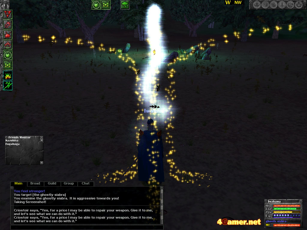 新部下のFugahogaは,"Firbolg"というちょいと大きめの種族の女性で,職業は"Blademaster"。ただしプレイしているのは男で,実をいうと当編集部のKawamuraである。本人曰く「みんな男性キャラだから,ビジュアル的に花が欲しいでしょ?」とのことだが,Kawamuraの美的センスを疑ってしまうのは筆者だけではあるまい(Gueedは別として)。