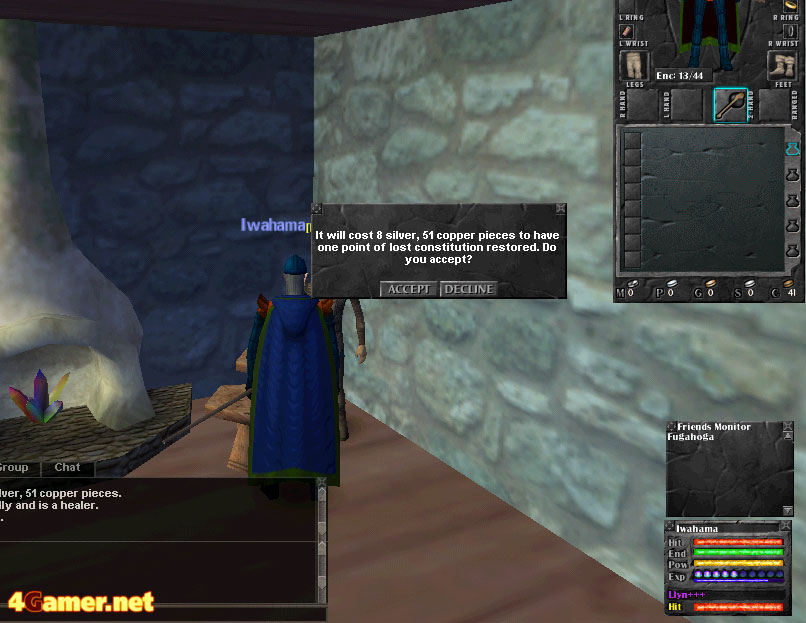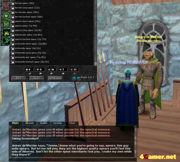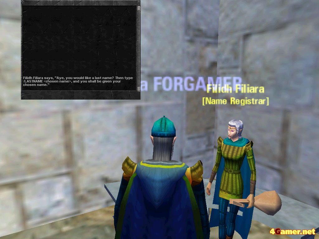 またFilidhさんのところへ行き,名字の変更依頼をするIwahama(キャラ名)。(たぶん)ニッコリ笑って10G要求するFilidhさん。ハハハ,僕を誰だと思っているんだい? ほら10Gだぜ! ……と思いつつ,名字修正完了! ちなみに新しい名字は,「Gggg」。ほら,"G"が四つで4Gって意味ね。いいでしょ? というわけでDAoC中で出会った部下達に意見を求めると,