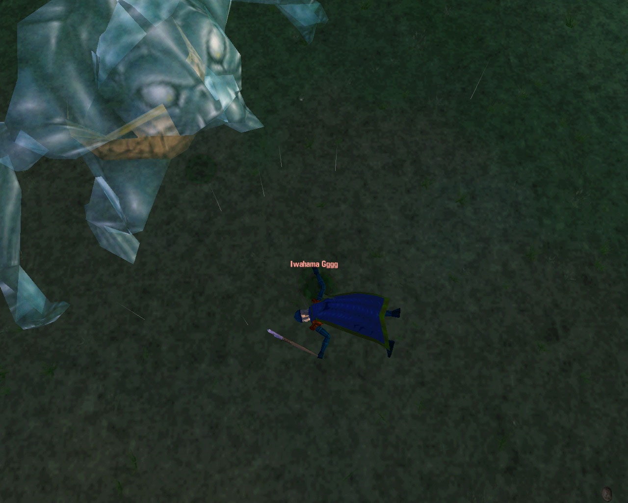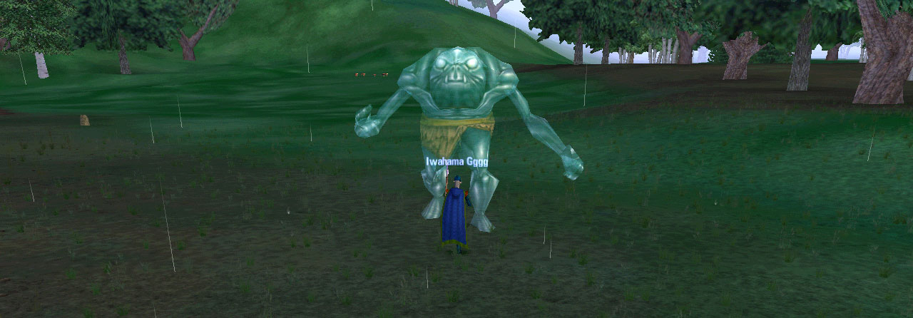 さて,Iwahama(キャラ名)の見てくれが比較的マシな状態のときの話である。いつものように黙々とモンスターを狩っていたら,下のような光景を目撃した。これってMurayama編の第14話に出てた"デカキャラ"ってやつ? なんかスゲェー。