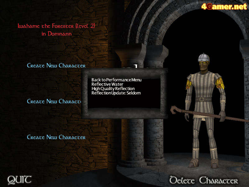 キャラクター選択の画面に戻って,オプションの項目をチェック。お,パフォーマンスという項目が増えている。ここで影,水などの設定が細かくできるようだ。すべて設定を変更して再びDAoCの世界に行くと……おぉ,なんかすげえいい感じな気がするのは筆者だけですか?