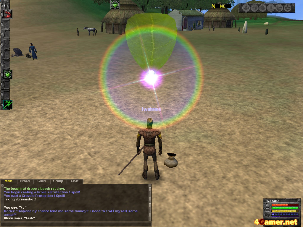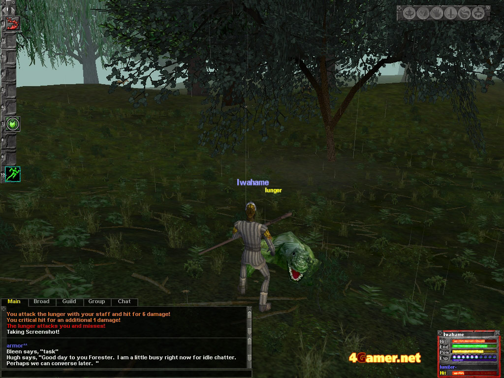 ともあれ,目の前にいるForest Trainerから杖をもらって,冒険スタート! お,画面左のクイックバーのスロットが10個に増えてる! これは微妙に嬉しい進化だ(これはSIだからじゃなくて,最新のパッチの影響らしいけど)。さて,まずはタスクでレベルを上げよう。できればモンスターを倒すだけの簡単なタスクが良かったので,そこらの名前付きのガーディアンに「/whisper